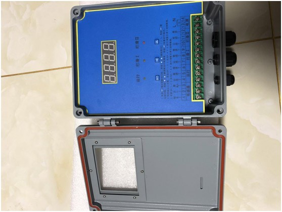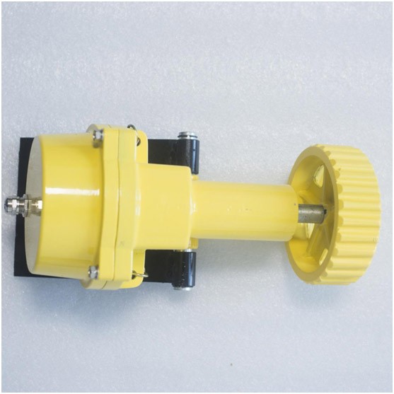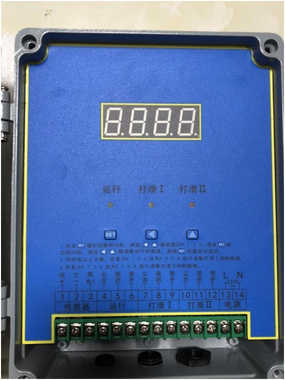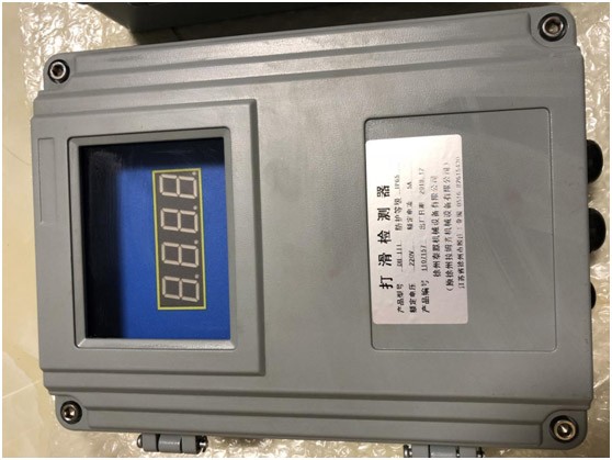打滑檢測器工作時,通過膠帶帶動觸輪,使觸輪反應(yīng)出膠帶的實際帶速,觸輪帶動檢測器內(nèi)傳動軸,使產(chǎn)品內(nèi)部繼電器工作,繼電器工作主要是由輪片切割光電信號,由內(nèi)設(shè)固定數(shù)值與實際值產(chǎn)生對比數(shù)值從而產(chǎn)生通斷信號,完成檢測帶速工作,如果膠帶速度與主滾筒速度不同步并下降到正常帶速的20-30%時,接點通斷信號發(fā)生變化,重新輸出一組信號給控制室,警示工作人員膠帶已處于嚴(yán)重打滑狀態(tài)。